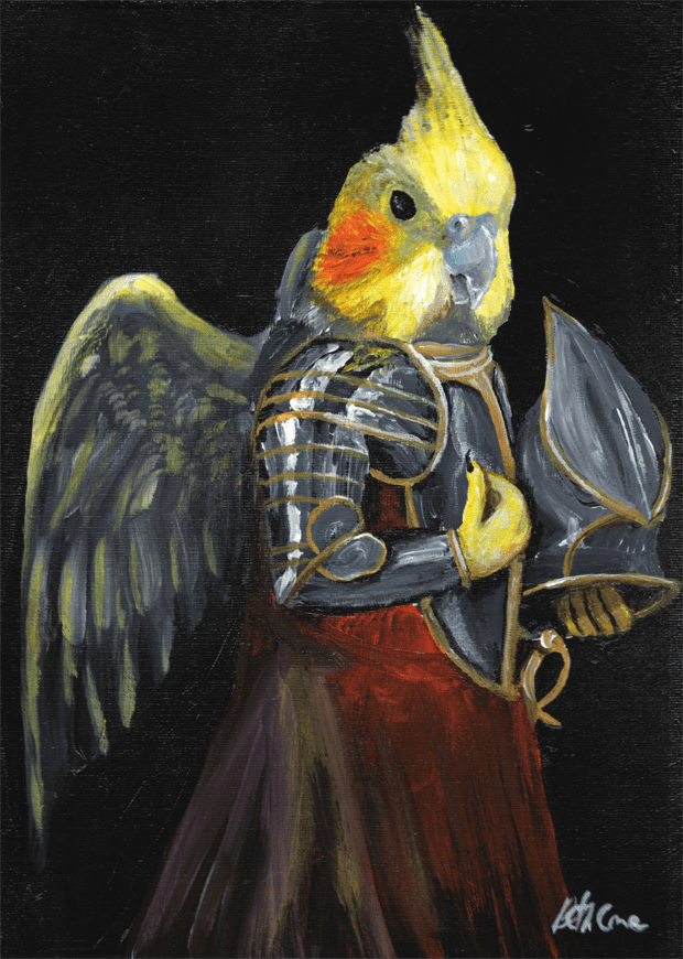 Marcus the Aarakocra Paladin, protector of the innocent, nibbler of seeds and pencils.